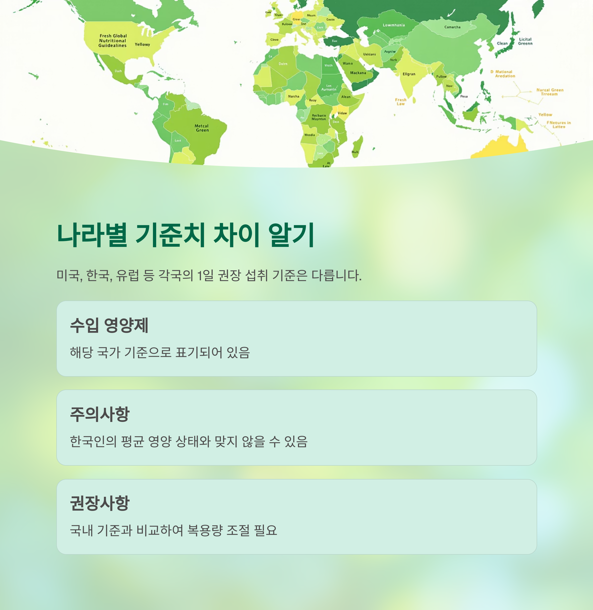 미국, 한국, 유럽 등 각국의 1일 권장 섭취 기준은 다릅니다.