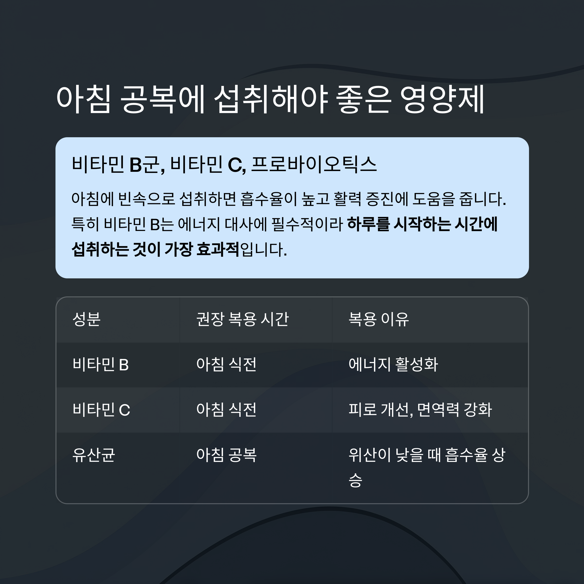 성분에 맞춘 시간대에 복용하는 습관이 건강을 더욱 향상시킵니다.