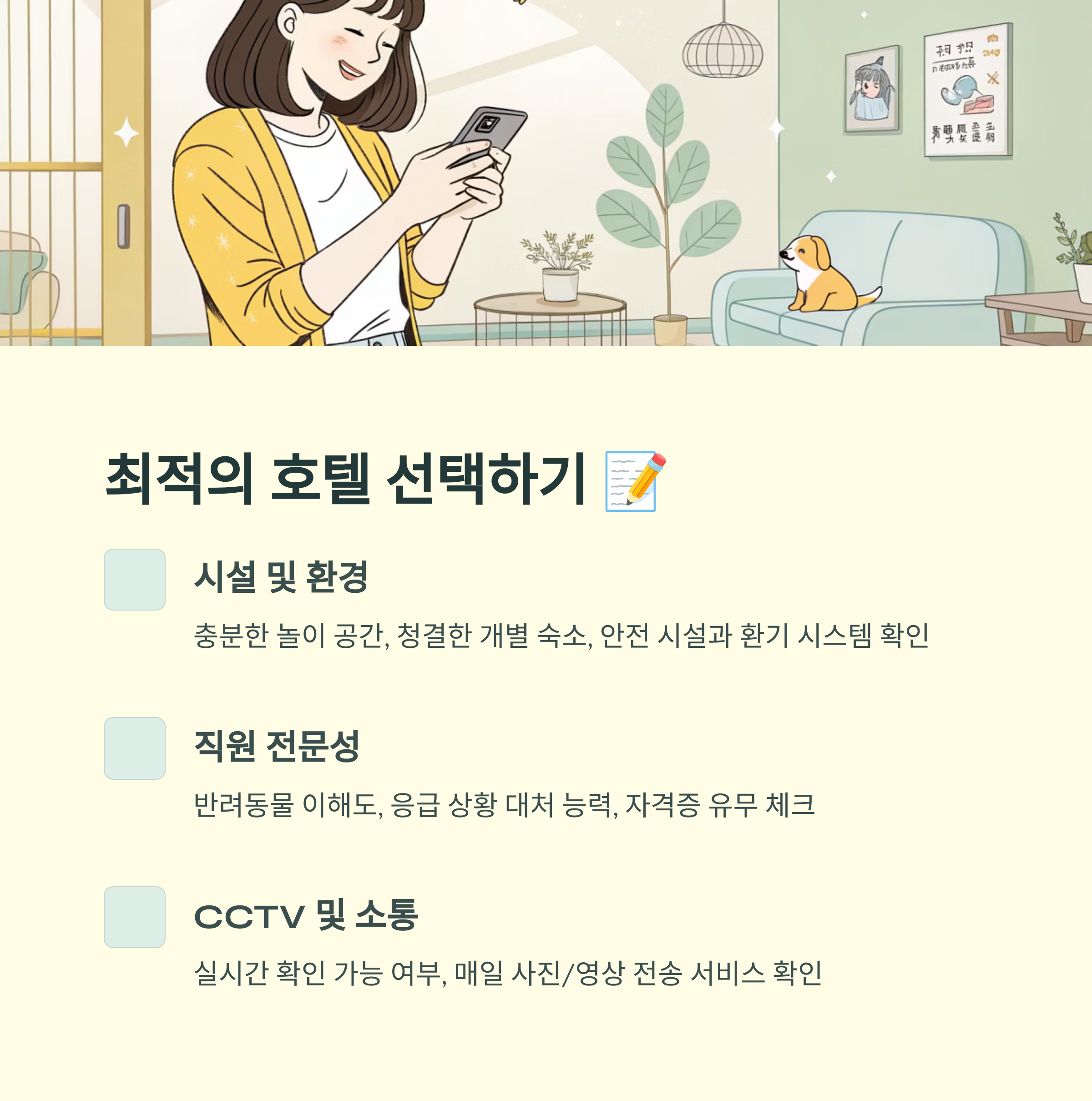 1. 호텔 선택: 시설, 직원 전문성, 프로그램, 소통 방식, 위생 등 다각도로 검토하여 우리 아이에게 최적화된 곳을 찾으세요.
