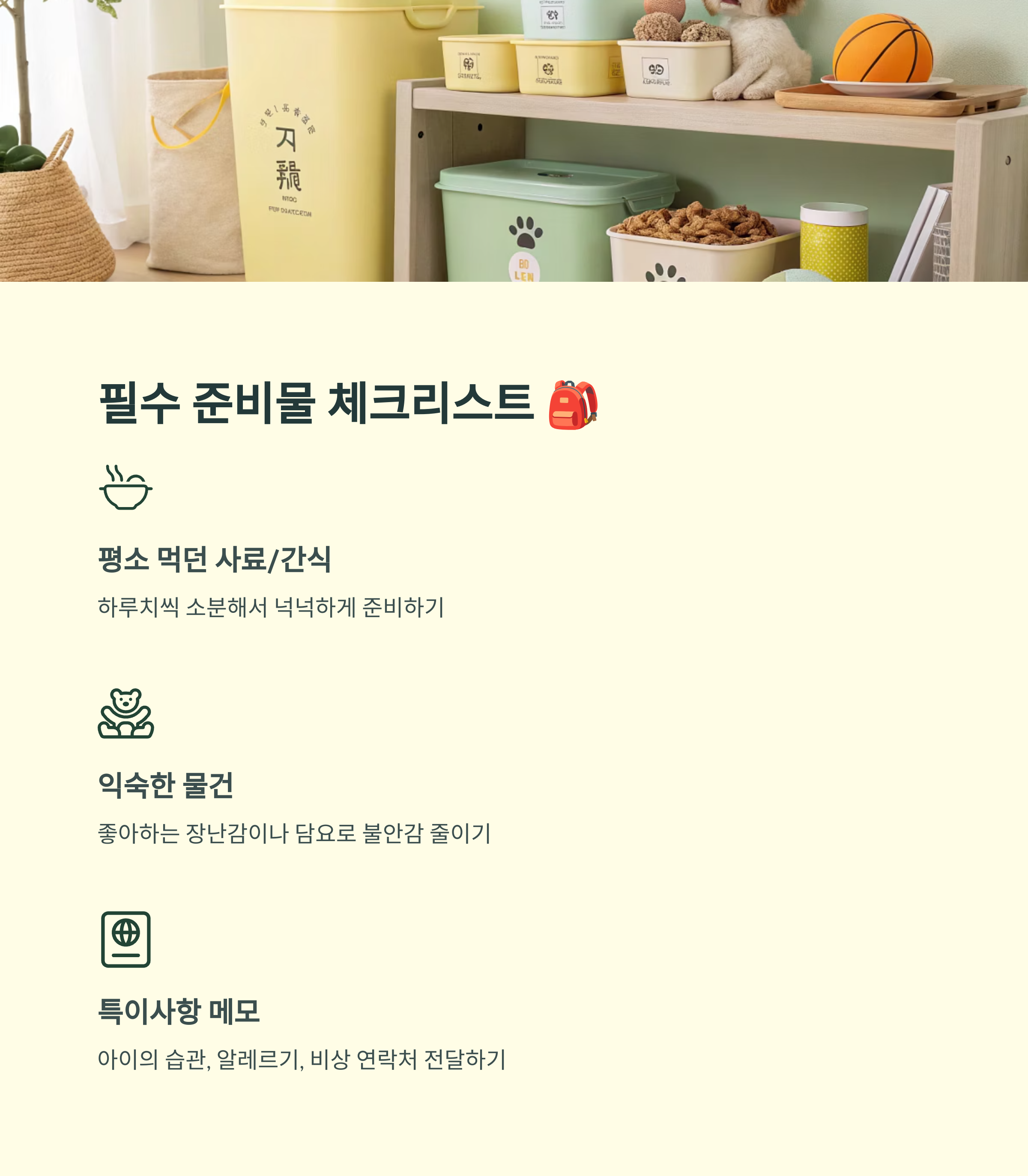 • 아이 특이사항 & 비상 연락처: 아이의 습관, 좋아하는 것, 싫어하는 것, 알레르기, 특정 행동 문제 등 상세한 정보를 전달하고, 위급 시 연락 가능한 비상 연락처를 여러 개 남겨두세요.