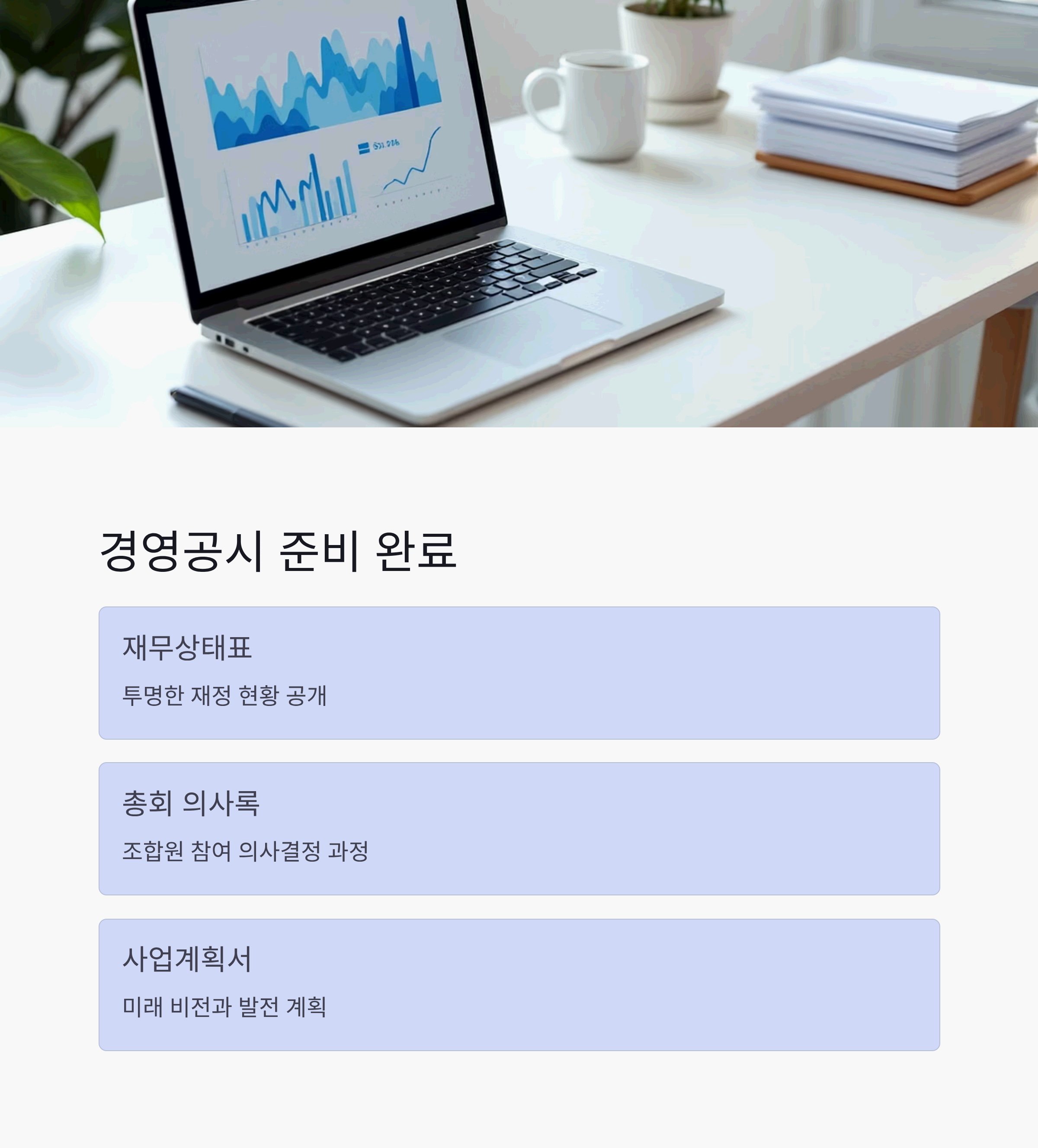 경영 공시는 단순히 규제를 따르는 행정 절차가 아닙니다. 우리 조합의 건전성과 책임 경영 의지를 대내외에 보여주는 가장 확실한 방법이자, 신규 조합원의 가입을 유도하는 긍정적인 신호가 될 수 있습니다.