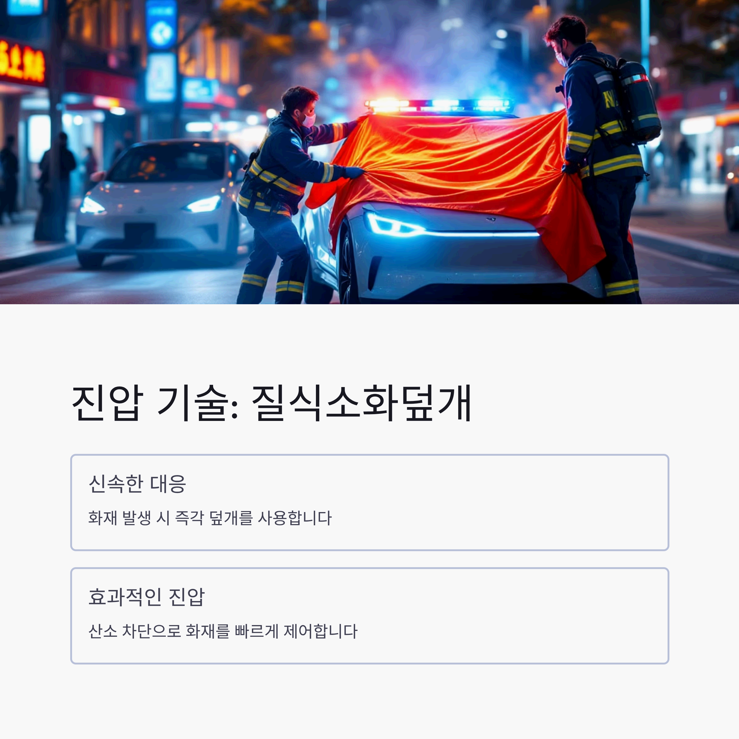 - 질식소화덮개: 불이 난 차량 전체를 내화성 특수 천으로 덮어 산소 공급을 차단하고 불길이 번지는 것을 막는 가장 효과적인 초기 대응 방법 중 하나입니다.