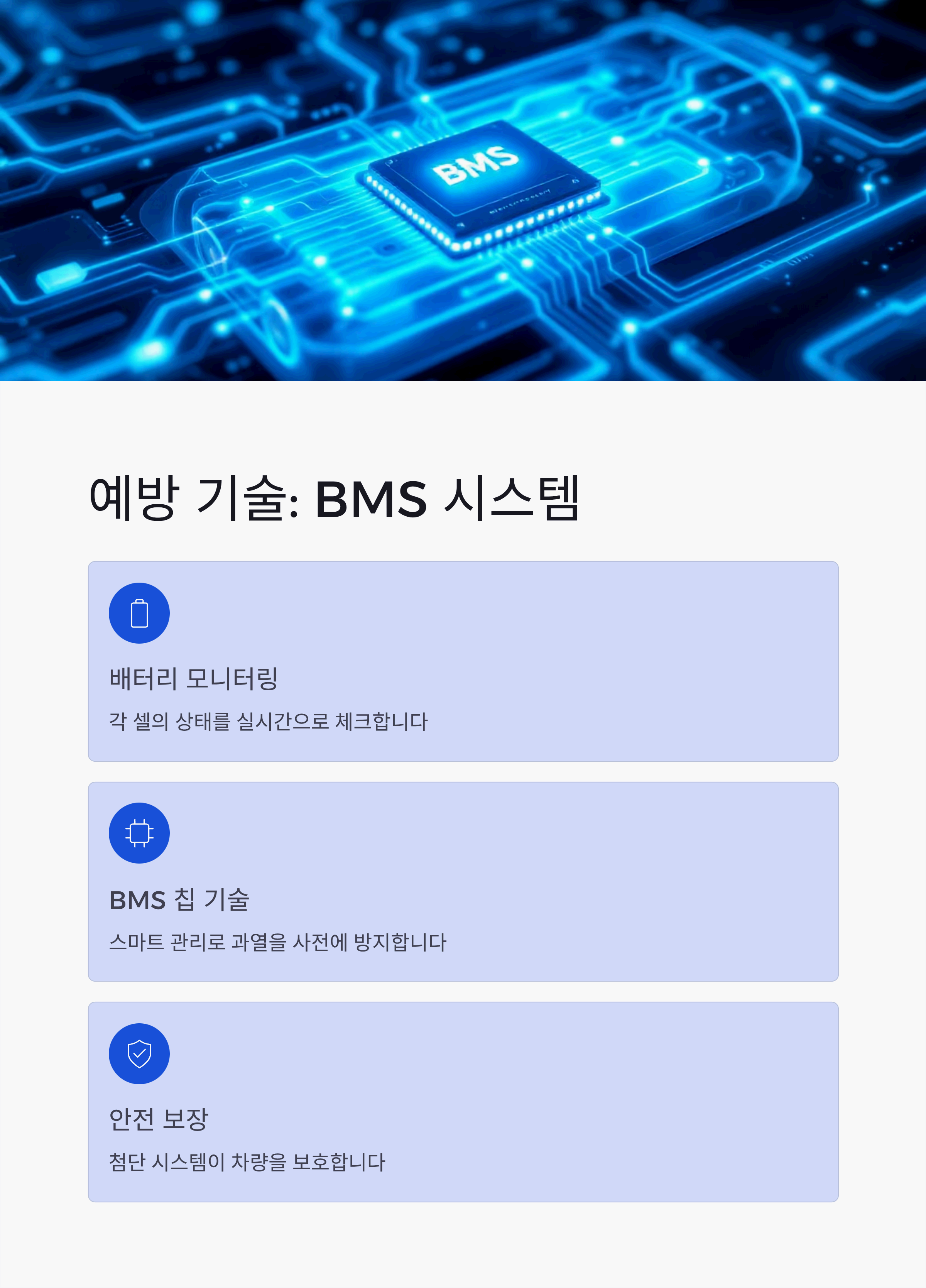 BMS는 배터리의 '두뇌'와도 같은 역할을 합니다. 수백, 수천 개의 배터리 셀 각각의 전압, 전류, 온도를 실시간으로 감시하며 이상 신호가 감지되면 즉시 전력을 차단하거나 운전자에게 경고를 보냅니다. 이를 통해 배터리가 위험한 상태에 이르지 않도록 사전에 제어하여 열폭주를 원천적으로 막는 핵심 기술입니다.