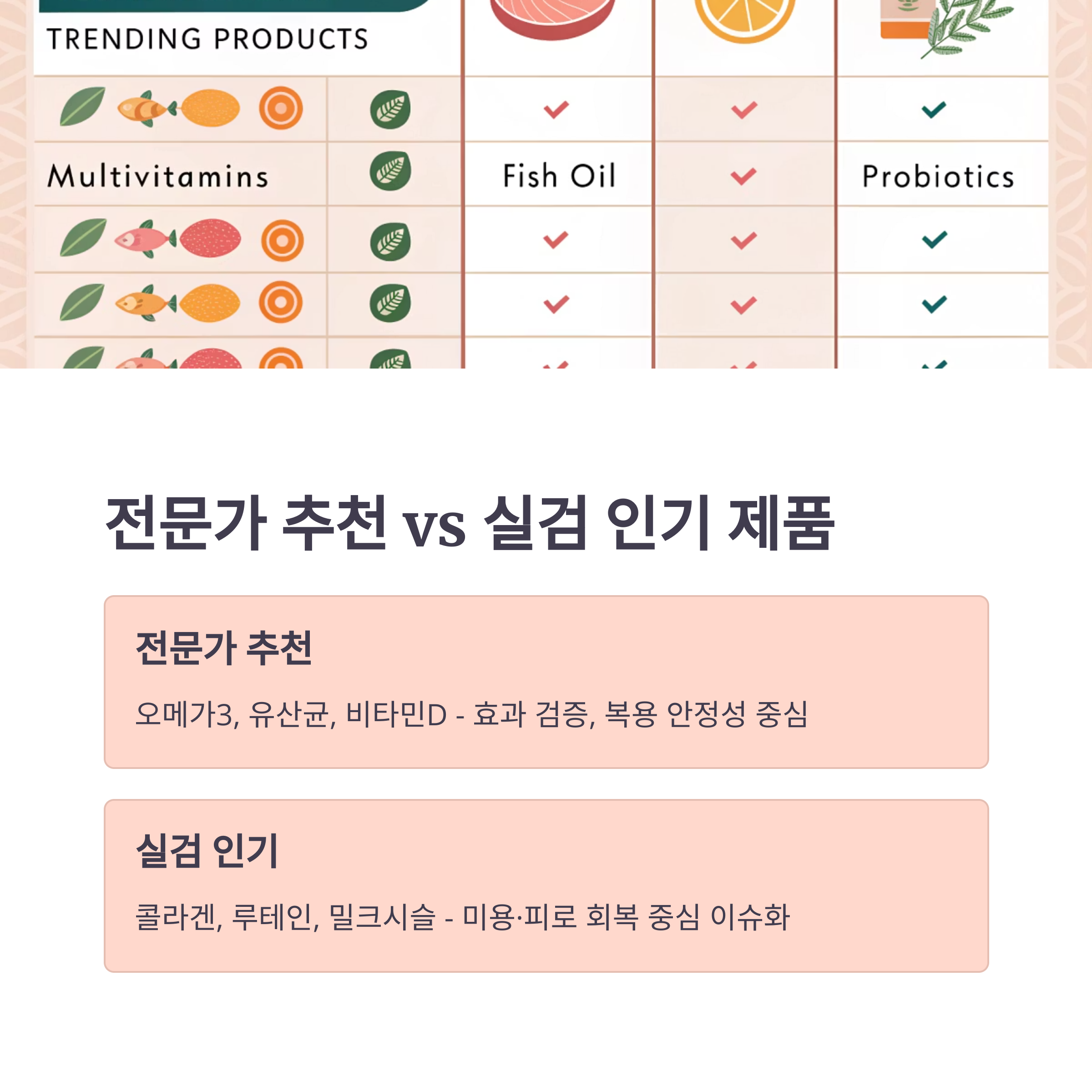 | 전문가 추천 | 오메가3, 유산균, 비타민D | 효과 검증, 복용 안정성 |