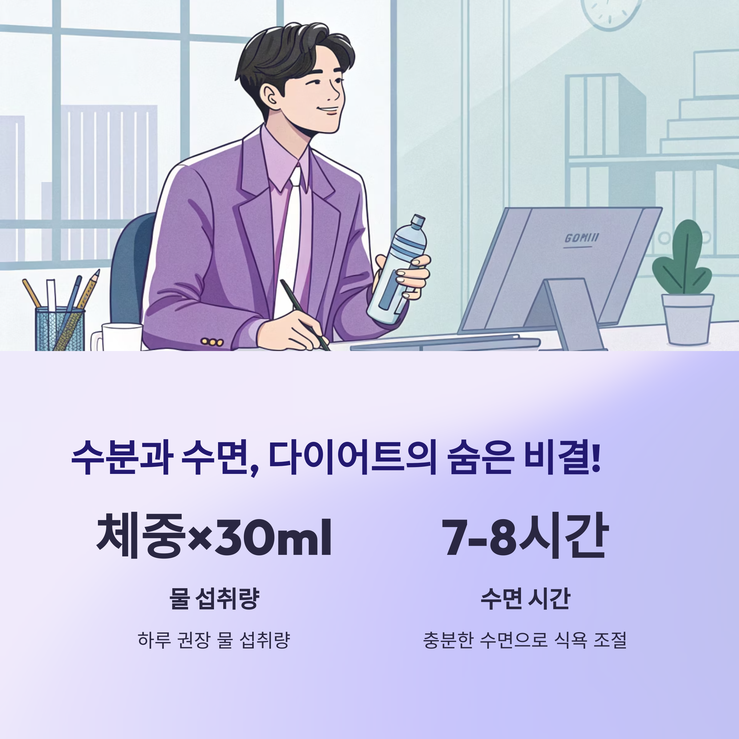 물 섭취량 = 체중(kg) × 30ml + 하루 7~8시간 숙면!