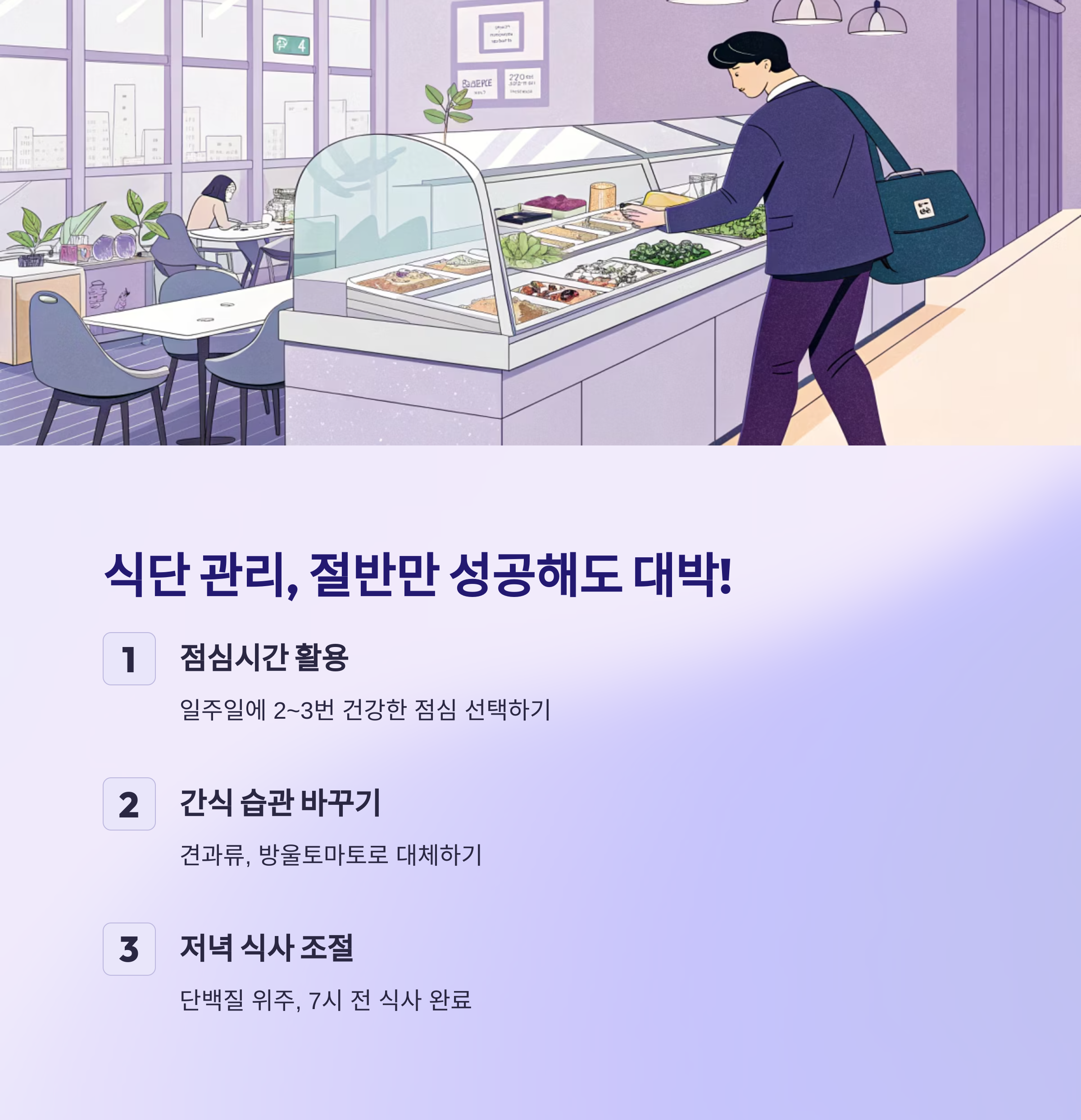 ✨ 식단 관리: 완벽보다 꾸준함! 점심시간, 간식, 저녁 식사에서 작은 변화 시도.