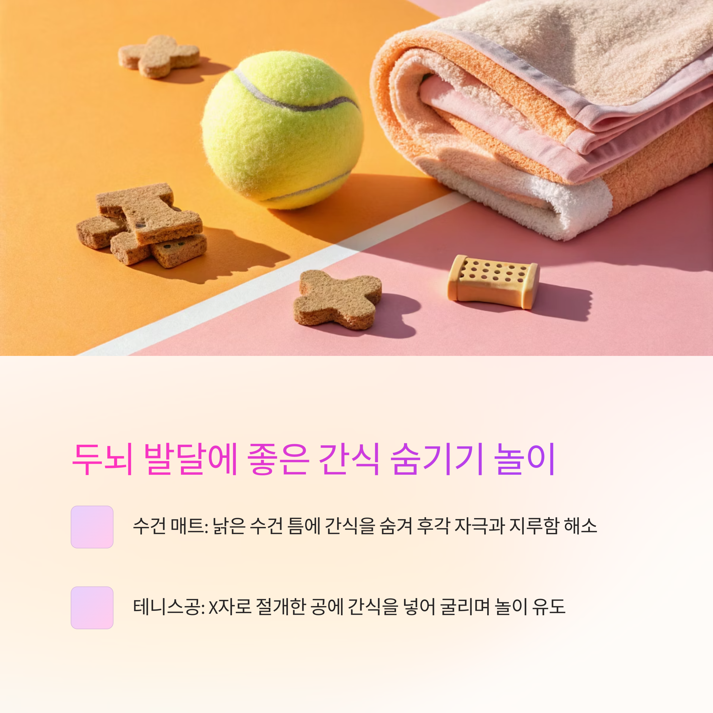 낡은 수건을 바닥에 깔고 여기저기 접힌 틈에 간식을 숨겨주세요.