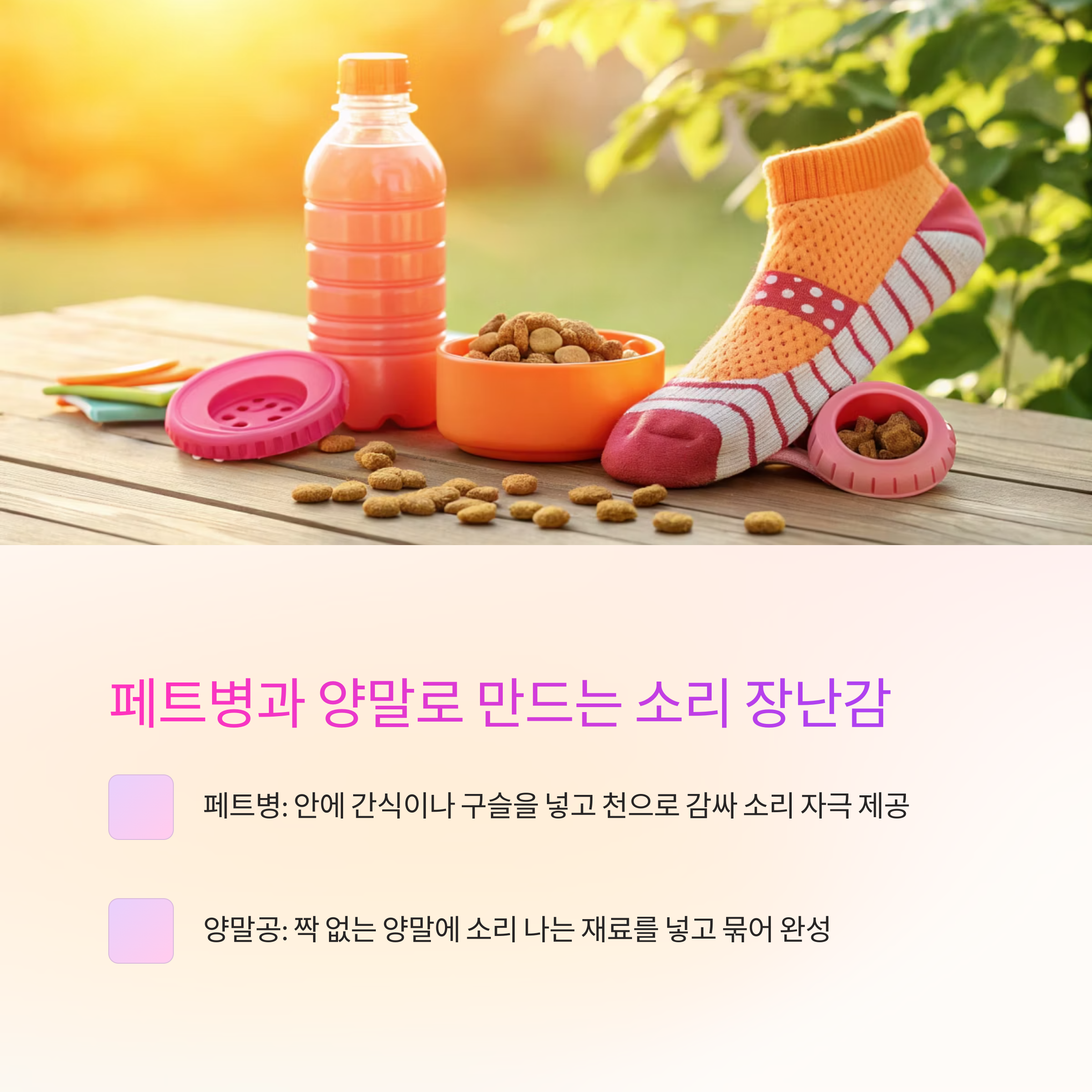 페트병 안에 작은 간식이나 구슬을 넣고 천으로 감싸 묶어주면