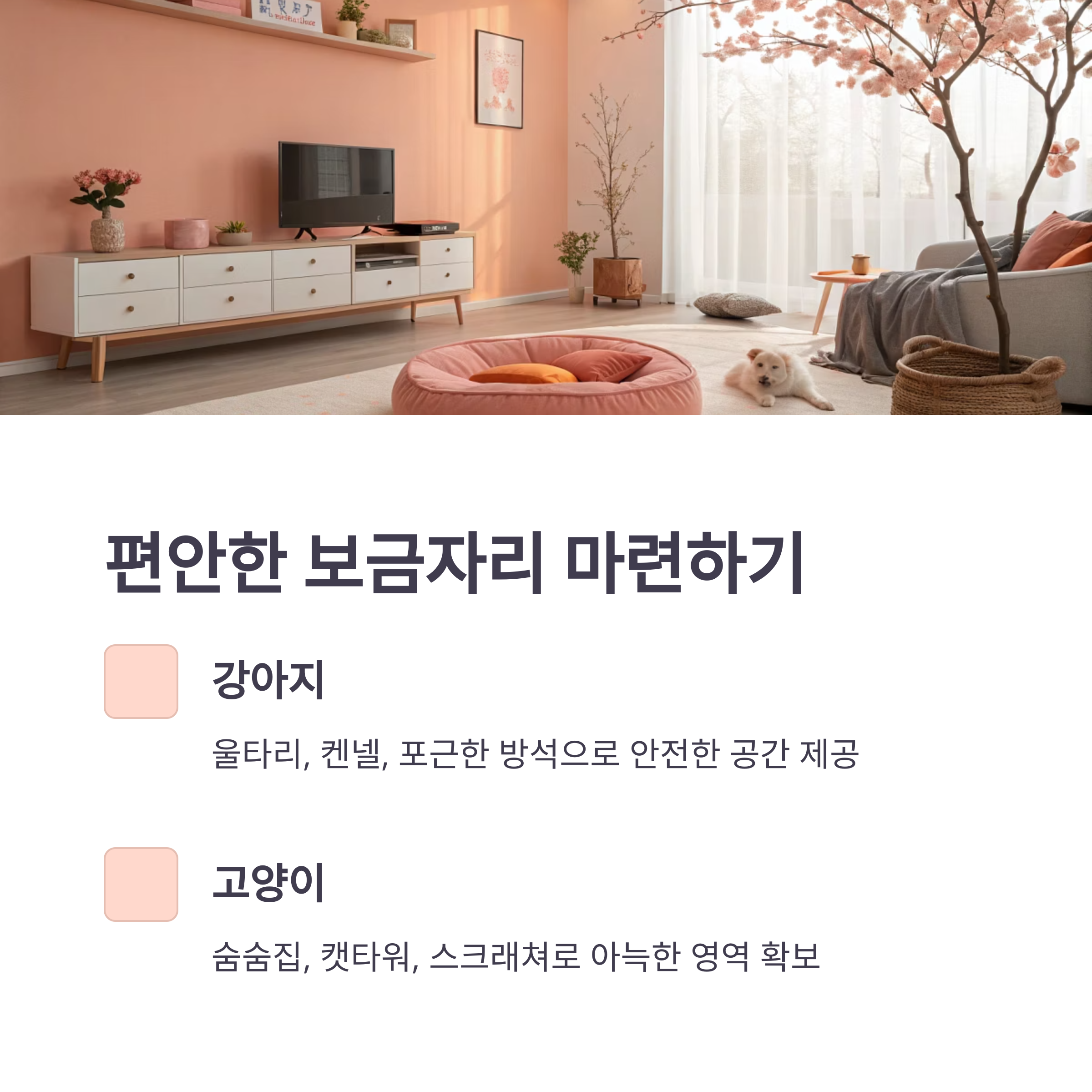 • 고양이: 숨숨집, 캣타워, 스크래쳐, 푹신한 방석