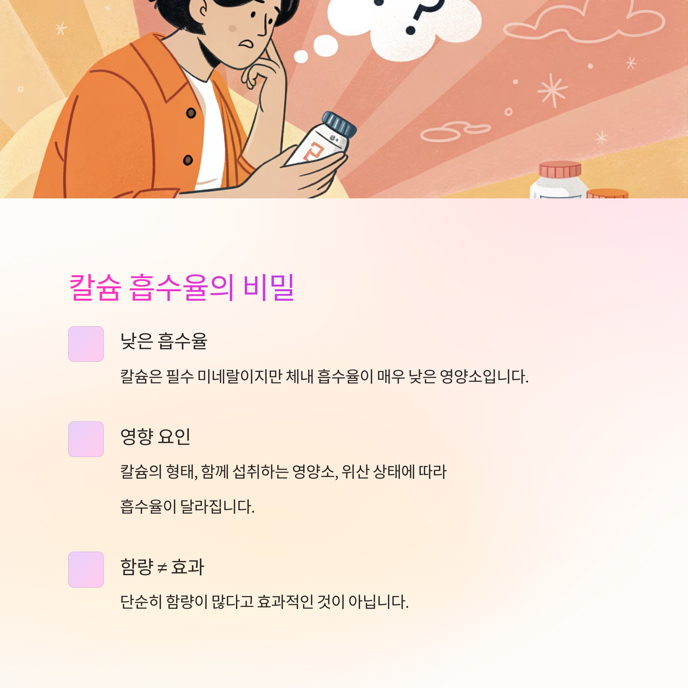 | 탄산칼슘 | 약 20~27% | 위산 필요, 저가, 고함량 | 일반 성인, 식후 섭취자 |