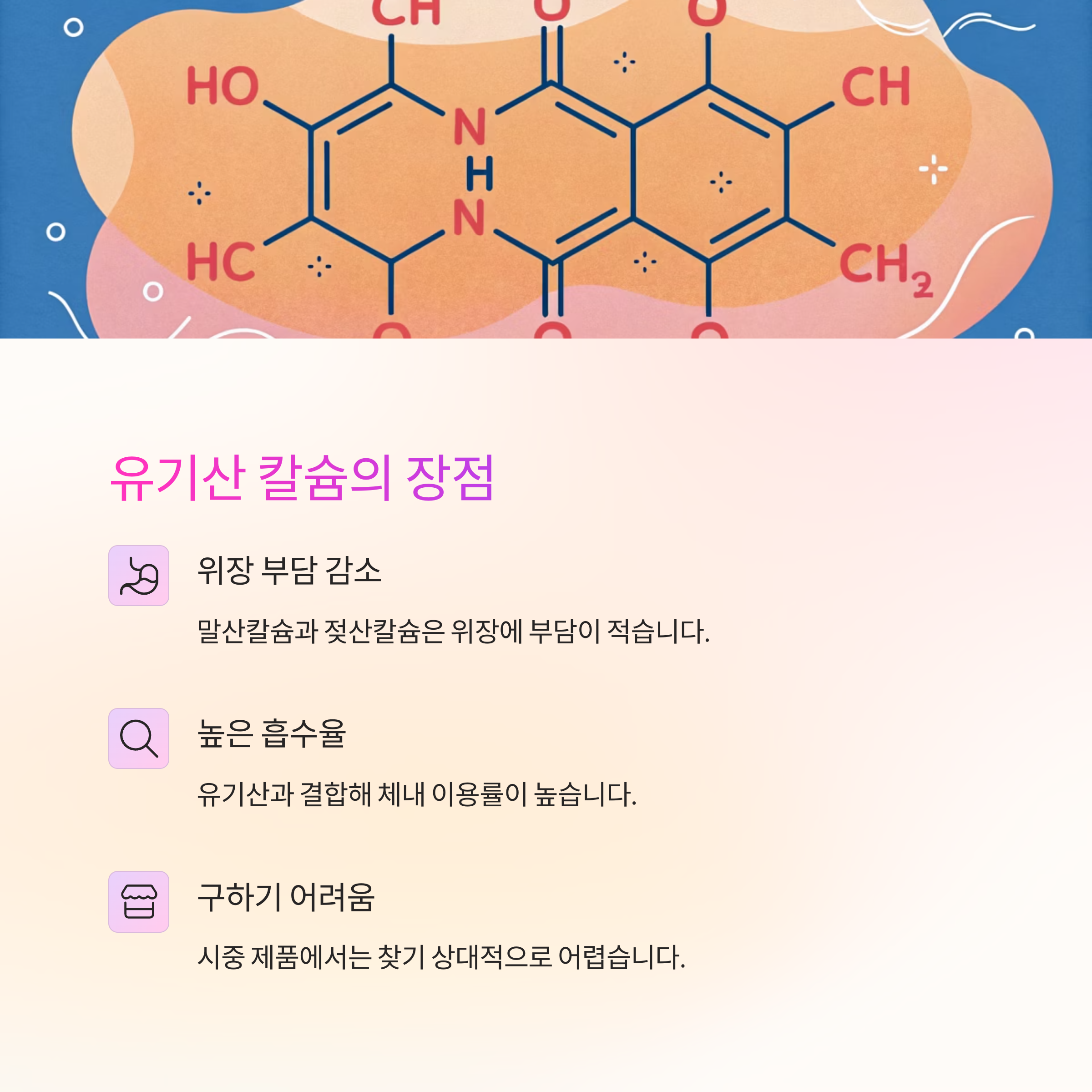 | 구연산칼슘 | 30~35% | O | 흡수율 우수, 위산 영향 적음 |