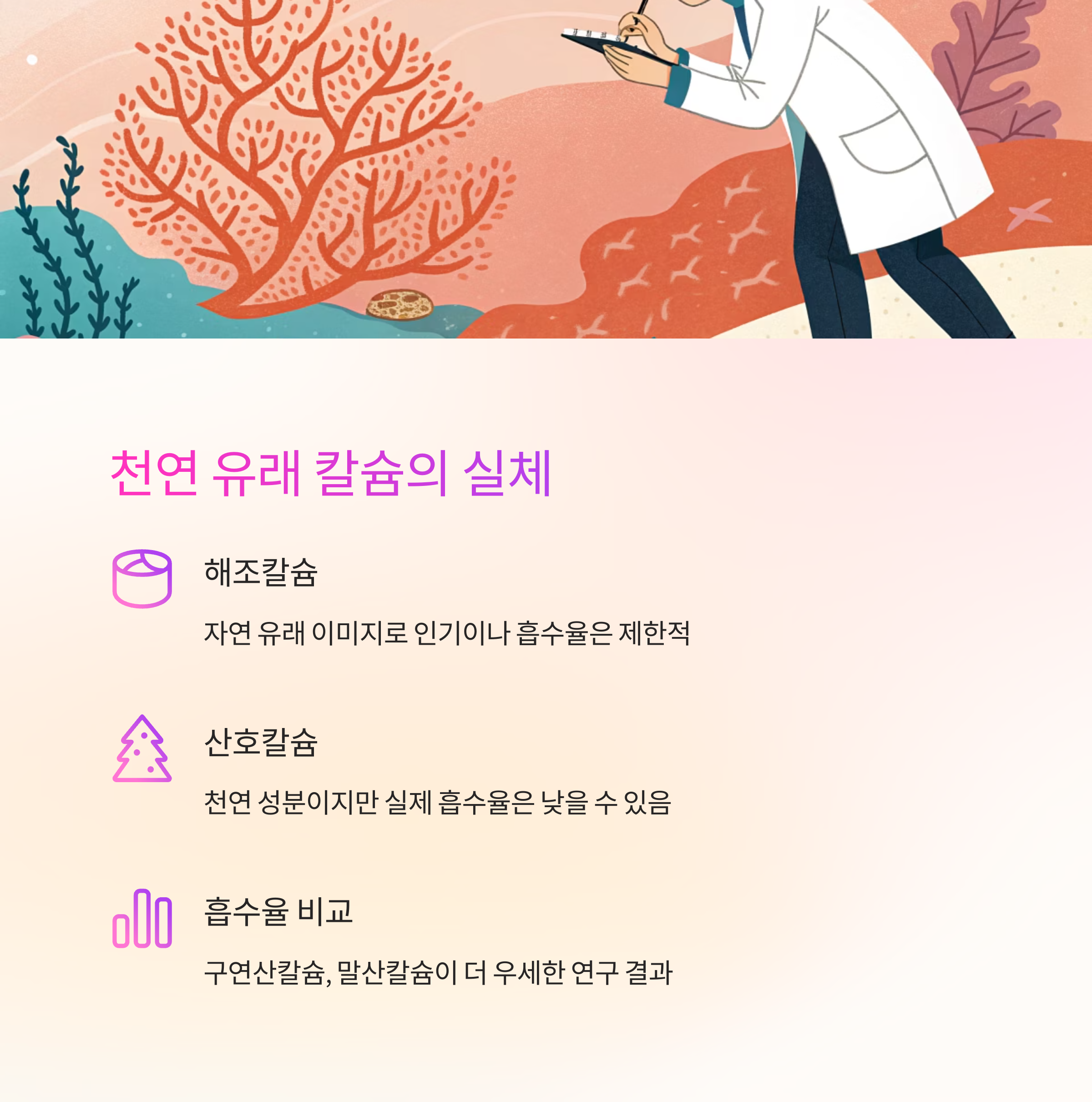 최근에는 자연 유래 이미지로 해조칼슘, 산호칼슘 등이 주목받고 있습니다.