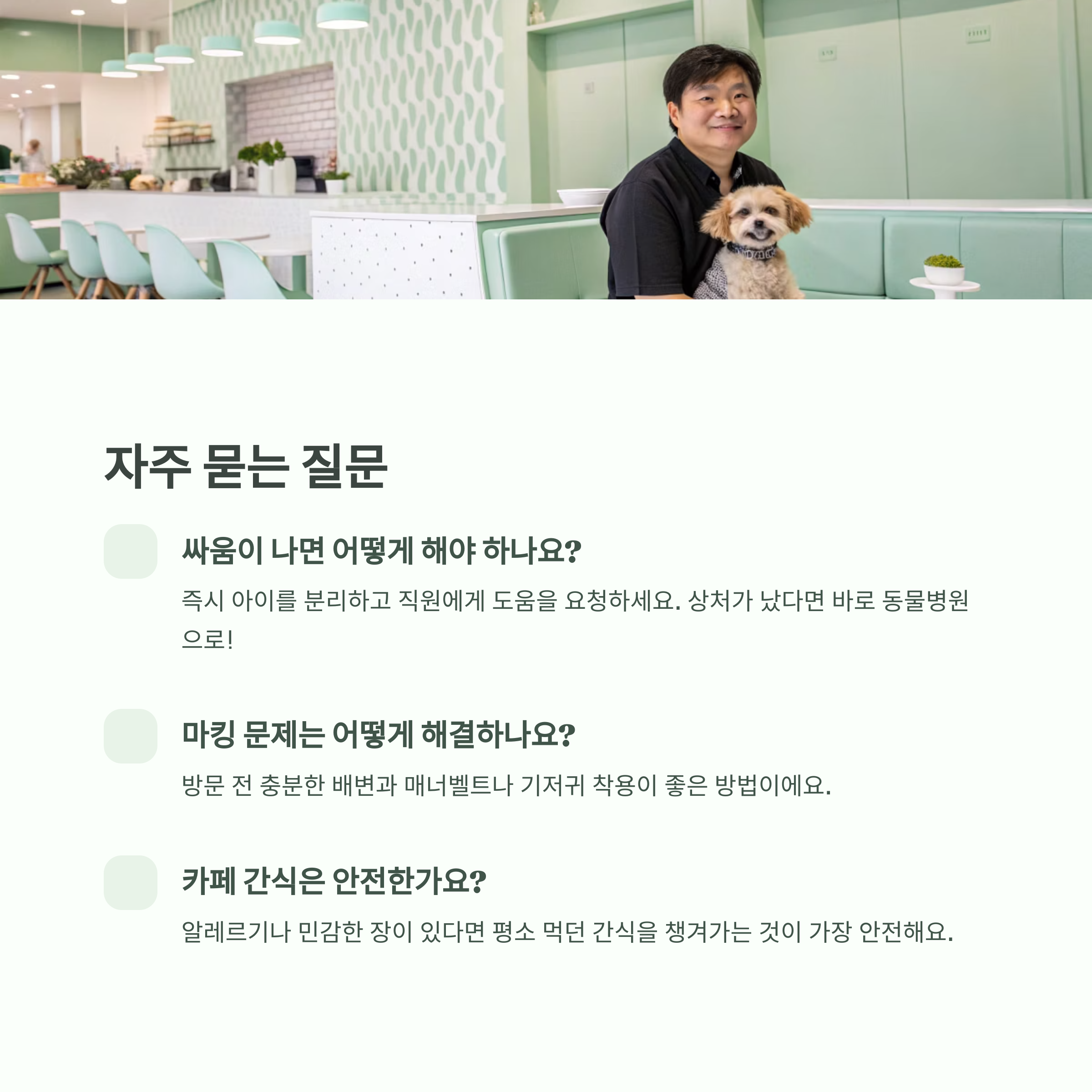 | 문의 전화 | 펫카페 직접 문의 | 홈페이지에 나와 있지 않은 궁금한 점이나, 우리 아이의 특별한 사항(예: 특정 알레르기)이 있다면 직접 전화해서 물어보는 게 가장 정확해요. |