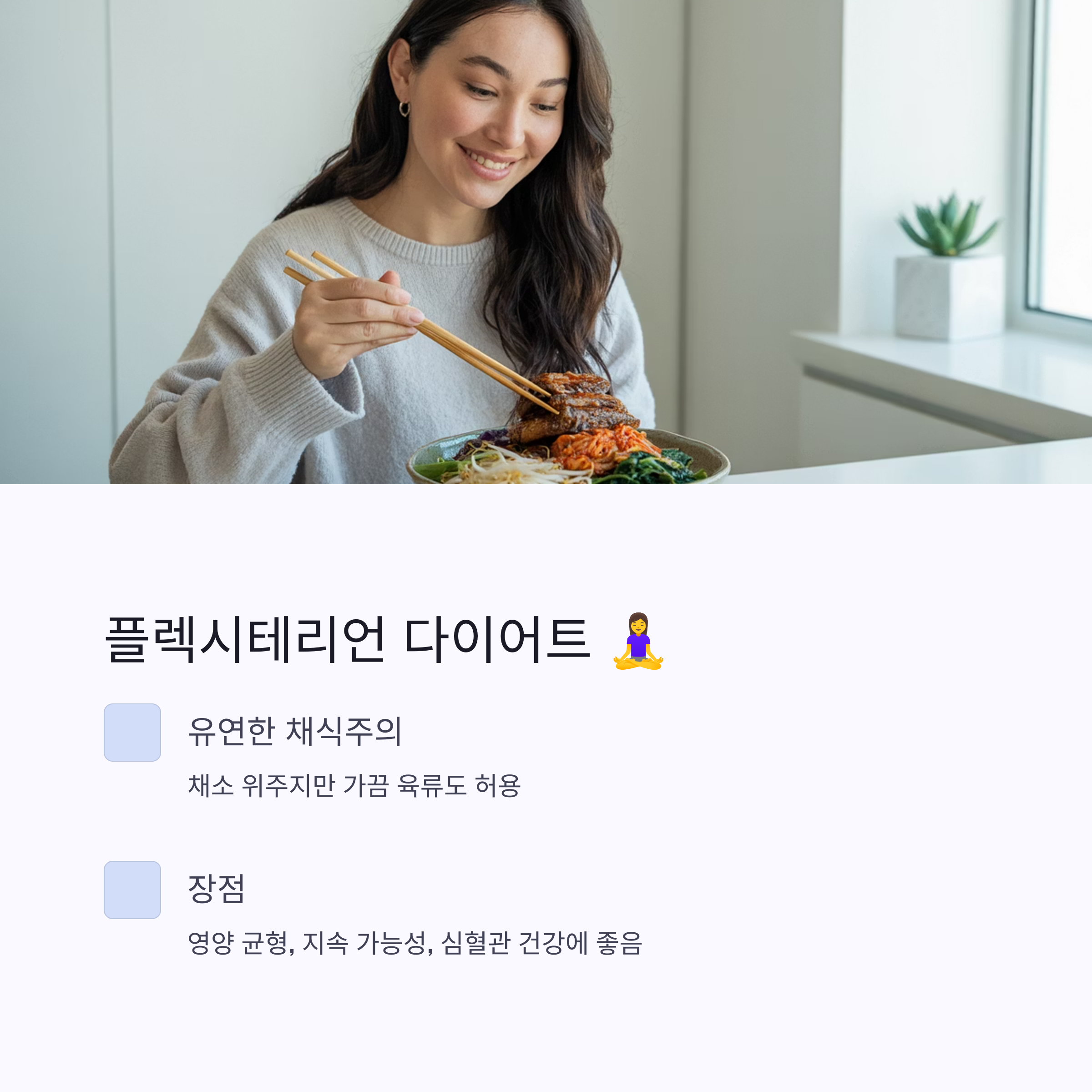 - 유연한 변화를 원한다면: 플렉시테리언이 좋아요. 평소 채소 섭취가 적었다면, 식단을 건강하게 바꾸는 좋은 계기가 될 거예요.