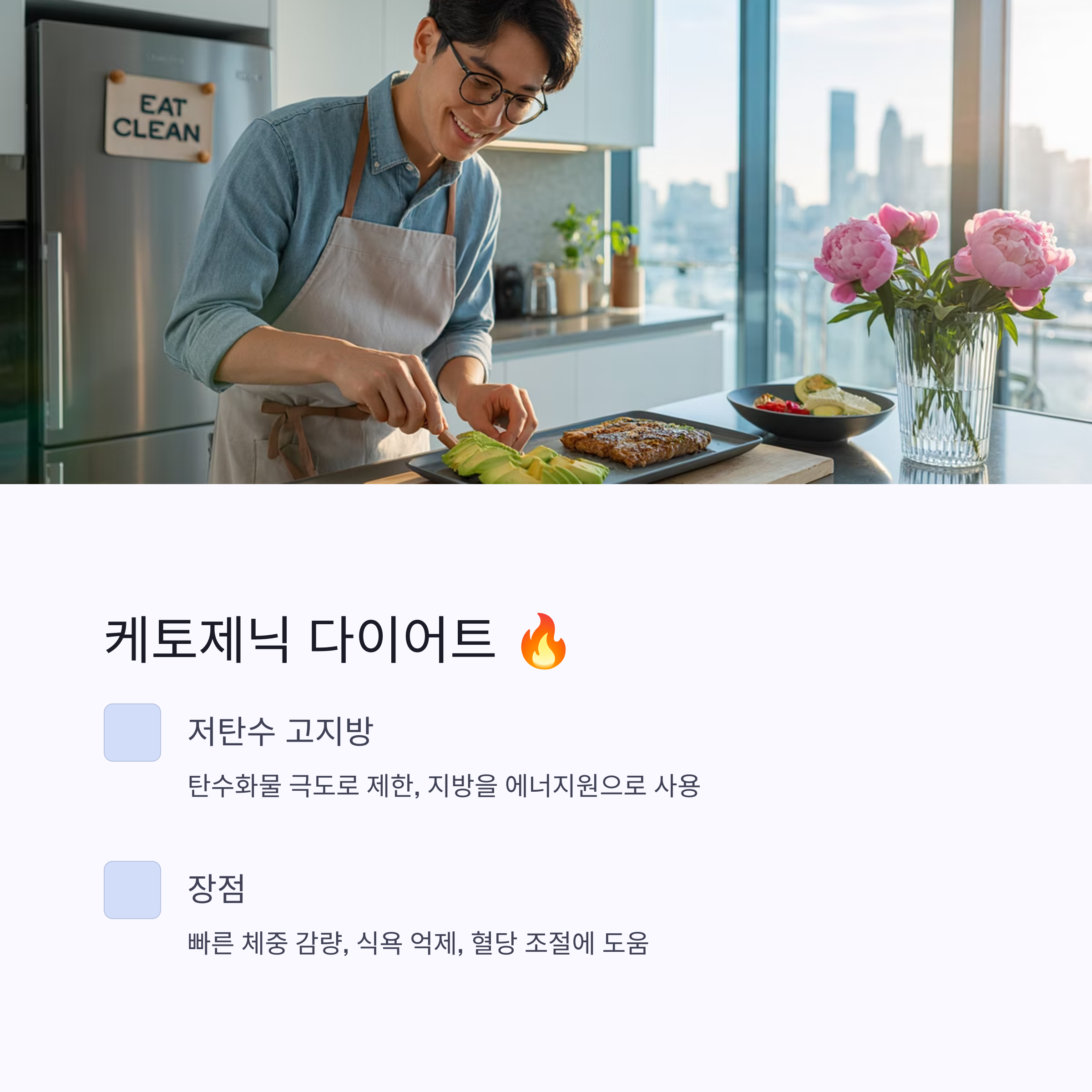 - 식욕 억제: 지방과 단백질 위주 식단으로 포만감이 오래가 식욕 조절에 유리해요.