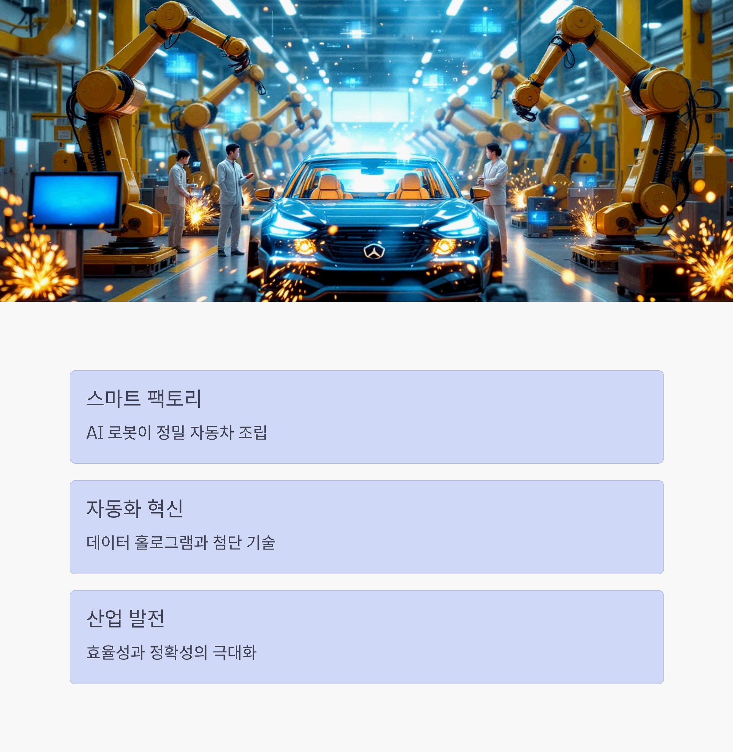 스마트 팩토리  테슬라의 휴머노이드 로봇 '옵티머스'가 대표적이에요. 복잡한 자동차 조립 공정을 사람처럼 해내죠. 국내에서도 현대자동차가 AI 로봇을 활용해 섬세한 부품 조립을 자동화하고 있어요.