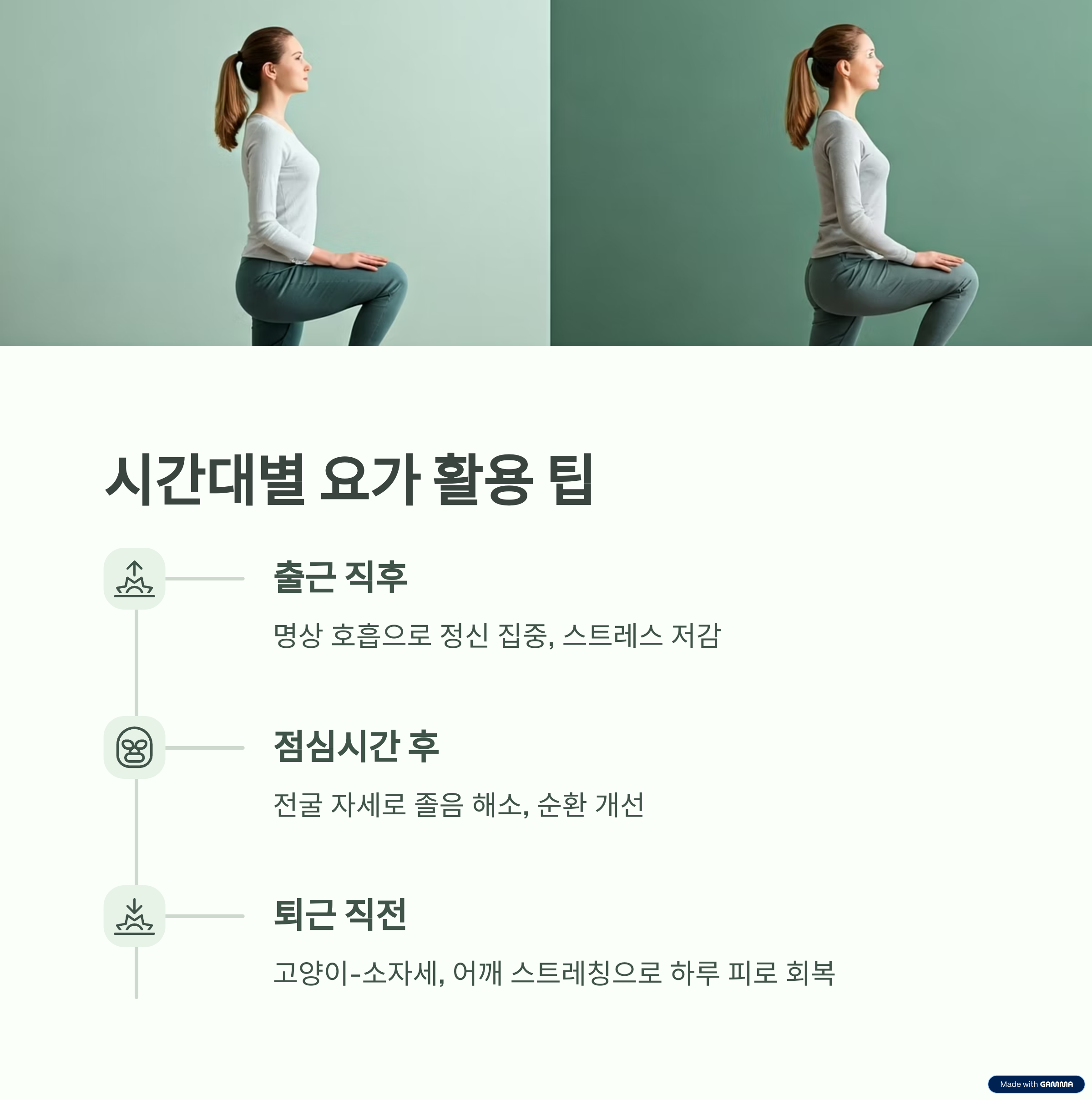 | 퇴근 직전 | 고양이-소자세, 어깨 스트레칭 | 하루 피로 회복 |