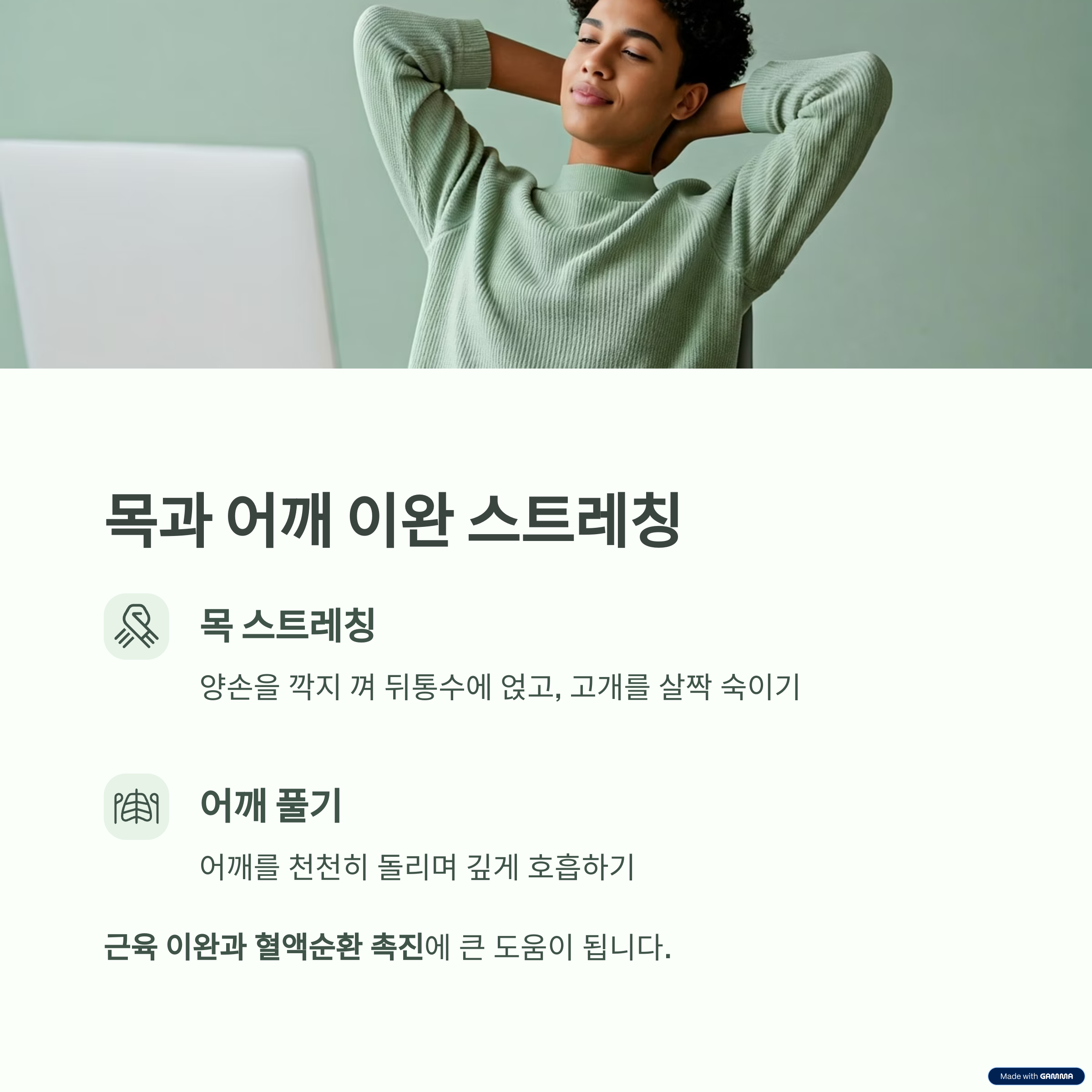 | 목어깨 스트레칭 | 2분 | 근육 이완, 피로 감소 |
