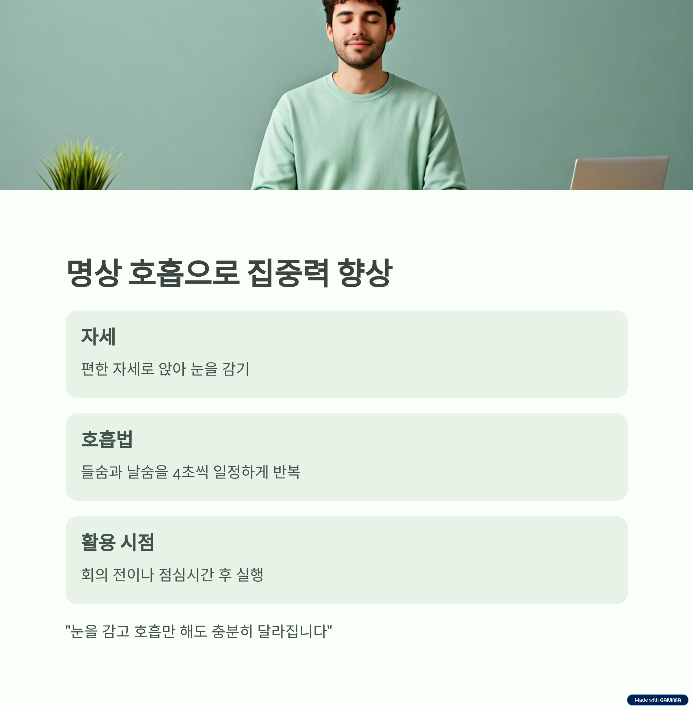 | 명상 호흡 | 4분 | 집중력 회복, 정신 안정 |
