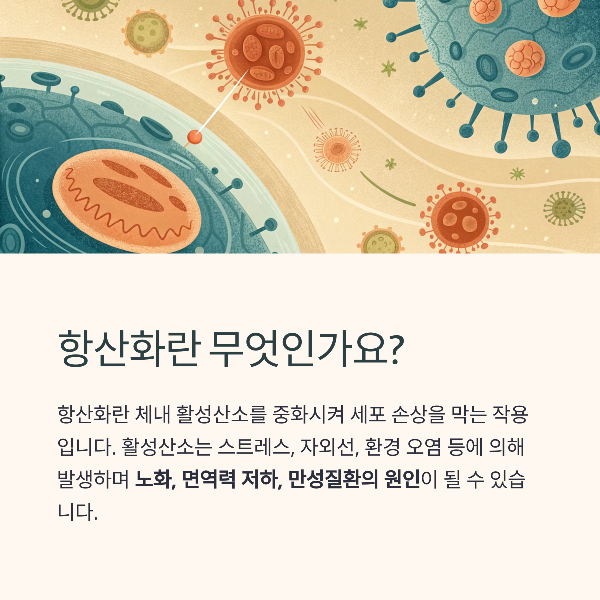 이로 인한 손상이 축적되면 노화, 면역력 저하, 만성질환의 원인이 될 수 있습니다