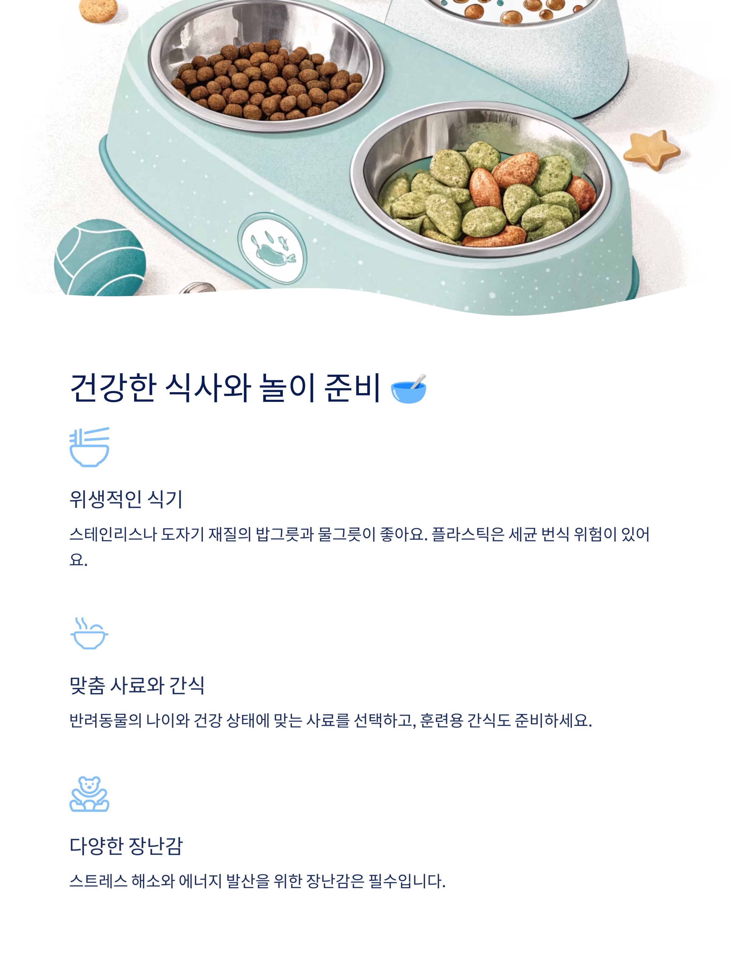2. 위생적인 식기: 스테인리스/도자기 재질의 밥그릇, 물그릇이 좋습니다.