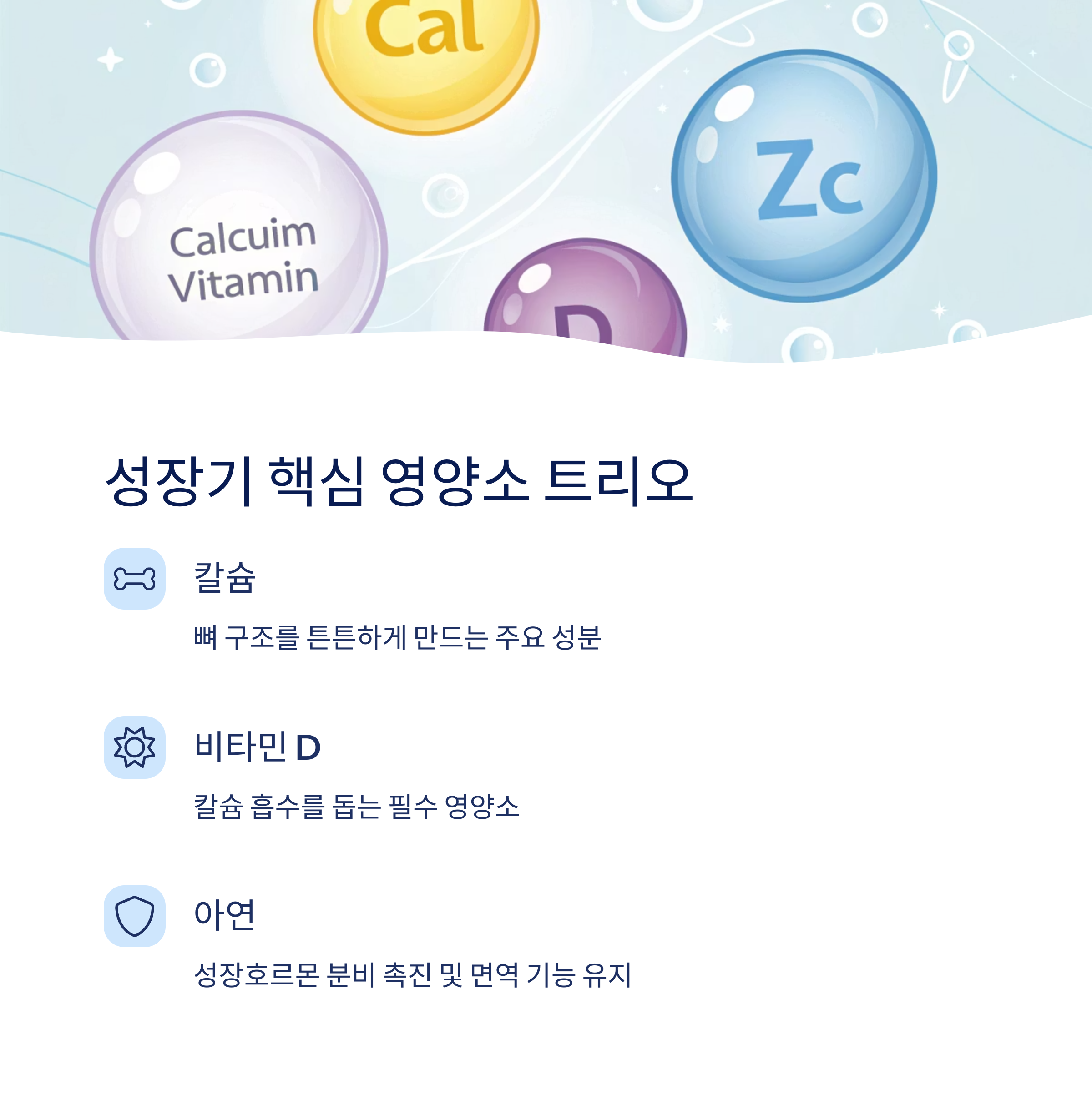 성장기 핵심 영양소는 칼슘, 비타민 D, 아연입니다