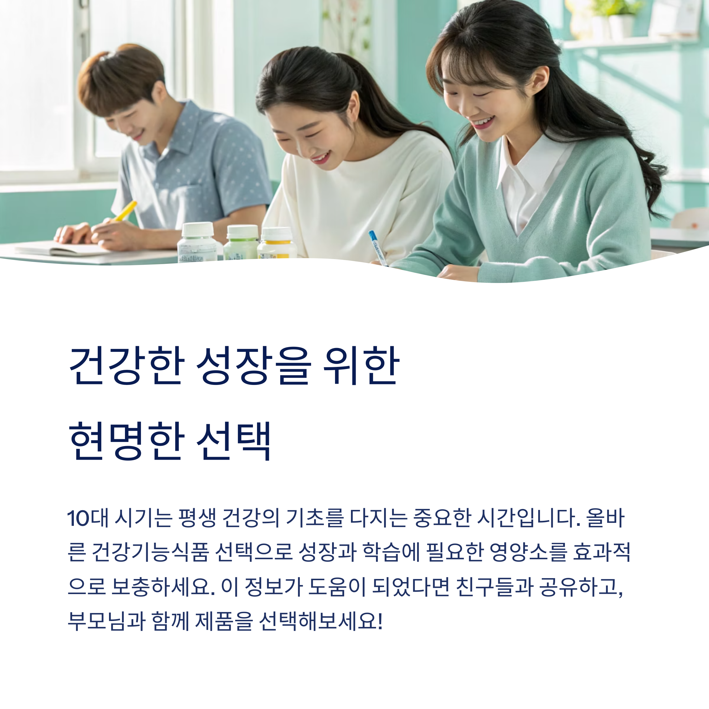 10대는 아직 완성되지 않은 몸과 마음을 지닌 성장기입니다. 건강기능식품은 필요한 만큼만, 정확하게 알고 선택하는 것이 가장 중요합니다.