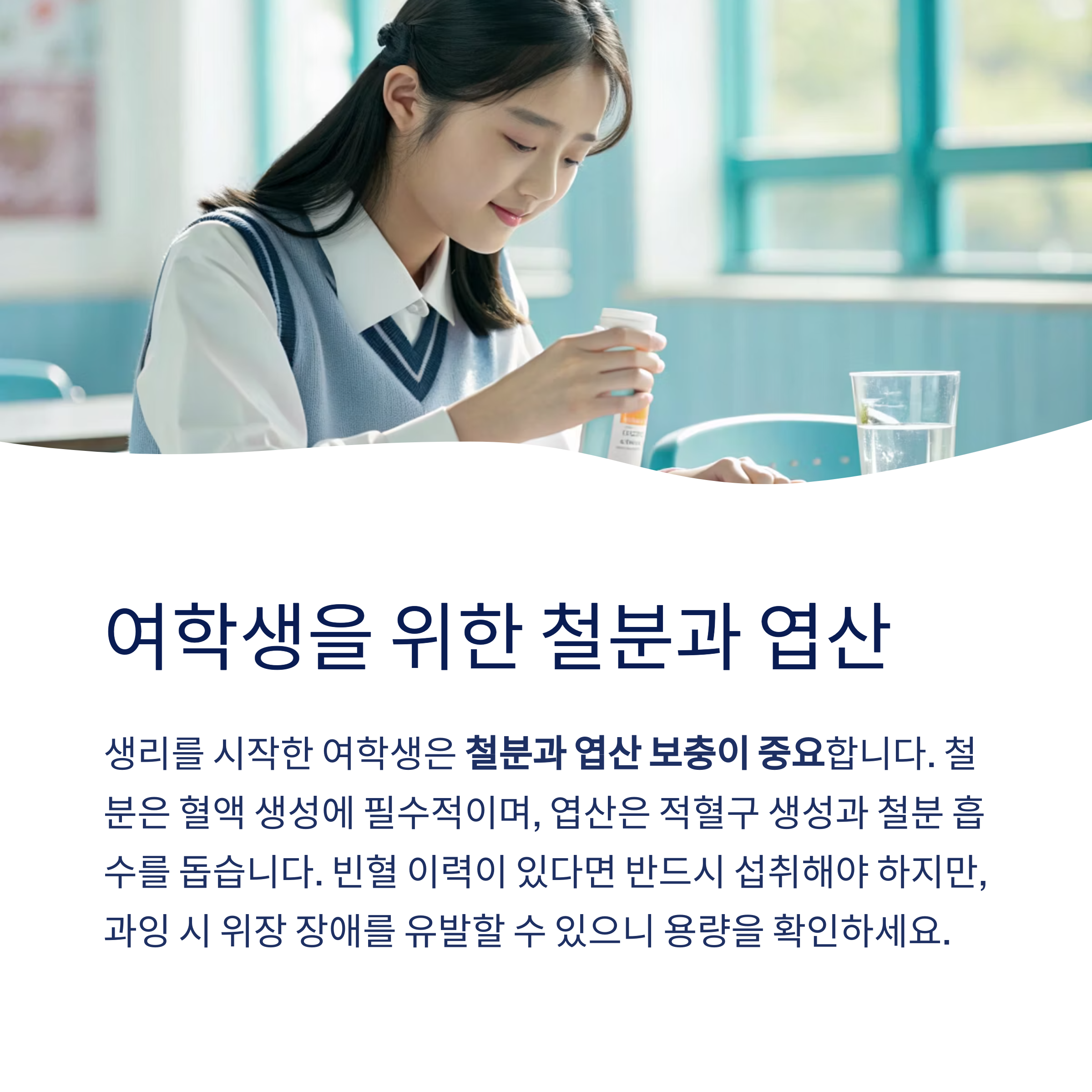 | 철분 + 엽산 | 혈액 생성, 피로 예방 | 여학생 중심, 빈혈 여부 고려 |