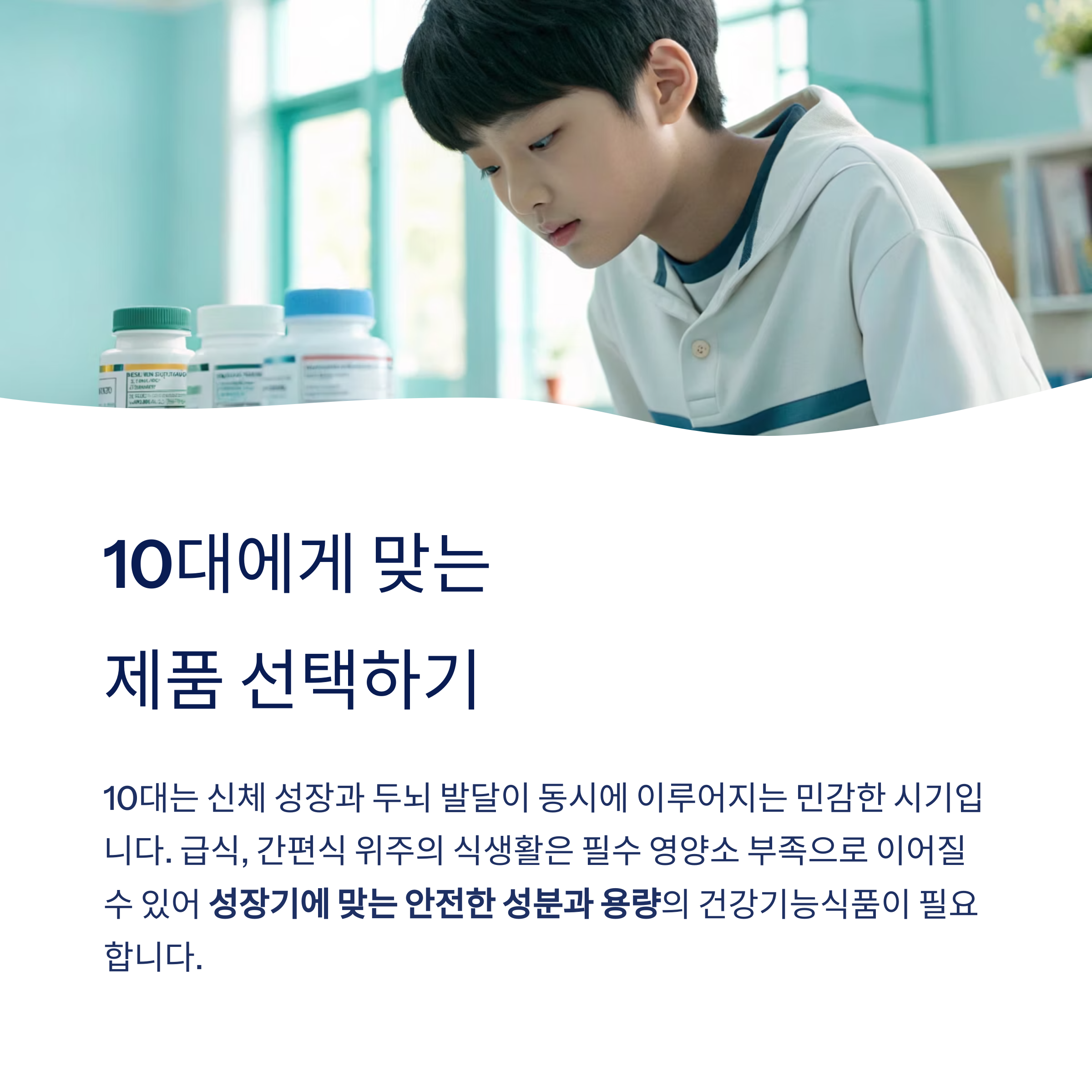 10대는 아직 완성되지 않은 몸과 마음을 지닌 성장기입니다. 건강기능식품은 필요한 만큼만, 정확하게 알고 선택하는 것이 가장 중요합니다.